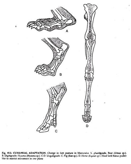 3. Change in foot posture (Fig. 45.2 A- C). Plantigrade (walking on sole) to digitigrade (walking on finger toe).