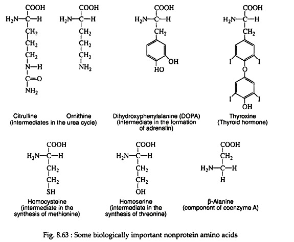 Streptococcus faecalis has a requirement for D-alanine; several antibiotics (actinomycin for one) contain varying amounts of D-leucine, D-phenyl-alanine, and D-valine. There are some amino acids which participate in various important biological functions but nevere became a part of protein molecules (Fig. 8.63).