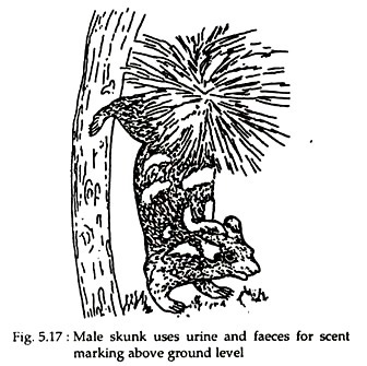 5. Male skunk and giant rats place their droppings above ground level by standing on their forelimbs. Their hind limbs are raised above the ground and supported against some solid object they defaecate and urinate (Fig. 5.17).
