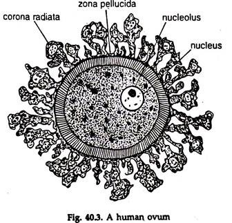 The ovum is a large, round structure. In human, according to the stage of development, it measures 117 to 142 µm in diameter. The cytoplasm of the ovum is termed yolk or ooplasm, the nucleus as the germinal vesicle and the nucleolus as germinal spot.