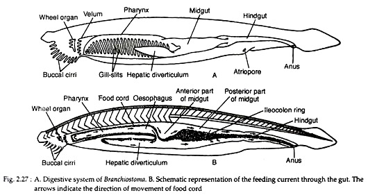 In Branchiostoma, the digestive and the respiratory systems are intimately associated with one another. The pharynx is a very elaborate structure which occupies more than half of the total surface area of the body. The food particles are filtered from the respiratory water current that passes in through the mouth and go out through the atriopore via the gill-slits.