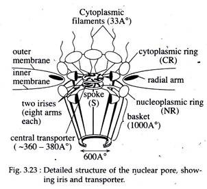 (iv) A basket attached to the nucleoplasmic side of the pore (Fig. 3.23). Nuclear pore complexes are the sites of exchange of macro molecules like proteins, RNAs etc. between the cytoplasm and the nucleus. Each single pore is capable of bi-directional transport (import or export) Which is facilitated by the presence of signal sequences.