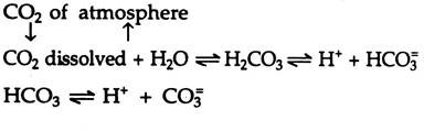 10. A litre of rain water contains about 0.3 ml CO2. The dissolved CO2 combines with the water of the ecosystem and forms carbonic acid, the reaction being always reversible.