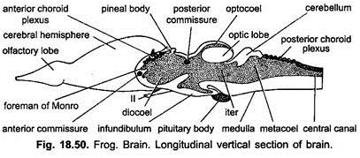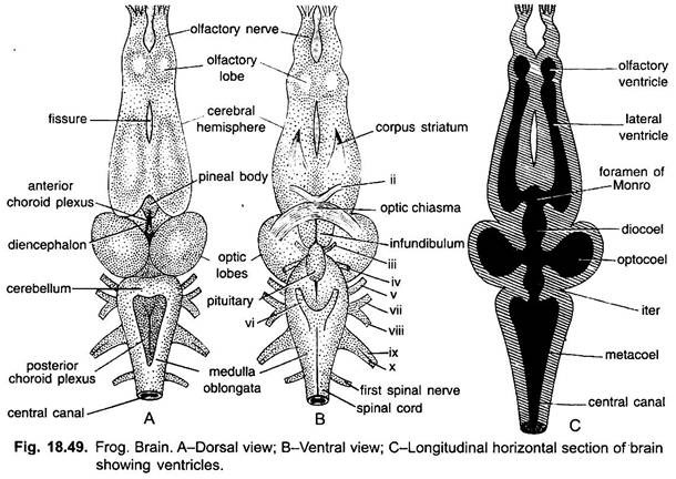 On ventro-lateral side of each of the cerebral hemispheres there is a thick fibrous tract called the corpus striatum containing a network of white medullated nerve fibres and nerve cells. The corpora striata of two hemispheres are joined by a transversely running tract of fibres called anterior commissure and above which is another commissure (upper line) partly representing the hippocampal commissure of the brain of reptiles and mammals. They have a thick roof called the pallium in which more nerve cells have moved to the periphery.