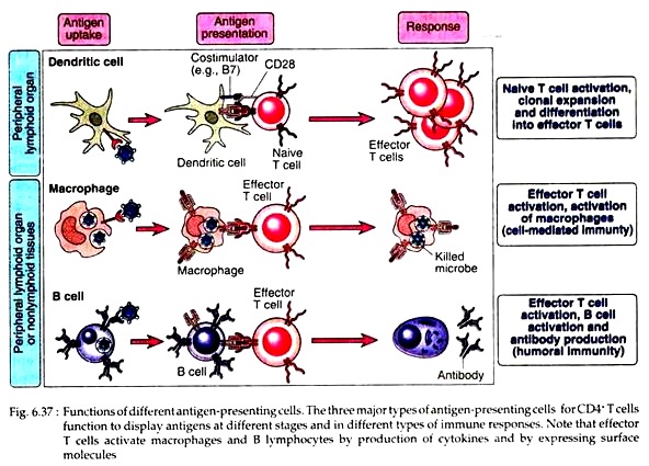 These cells express class II MHC molecules on their membrane. Generally these cells first internalise antigen either by phagocytosis or by endocytosis and then display a part of that antigen bound to class II MHC molecule on their membrane (Fig. 6.37).