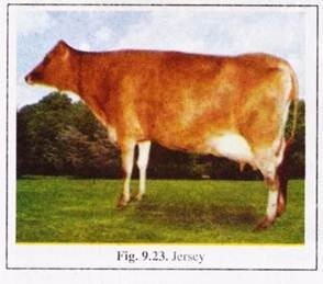 The Jersey breed (Fig. 9.23) originated on the Island of Jersey, a small British island in the English Channel off the coast of France. The Jersey is one of the oldest dairy breeds and has been reported to be pure-bred for nearly six centuries. This breed was known in England as early as 1771 and was regarded very favourably because of its milk and butterfat production.