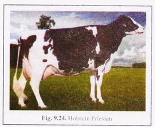 The Holstein cow (Fig. 9.24) originated in Europe. The major development of this breed occurred in the Netherlands and more specifically in the two northern provinces of North Holland and Friesland which lay on either side of the Zuider Zee. The original stock was the black animals and white animals of the Batavians and Friesians, migrant European tribes who settled in the Rhine Delta region about 2,000 years ago.