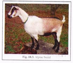 This breed was originated in Alps mountains. It was derived from French, Swiss and Rock Alpine breeds. They are horned and have no distinct colour. Average milk yield is 2-3 kg with butterfat of 3-4% (Fig. 10.3).