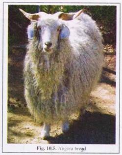 Originated in Turkey or Asia minor. It produces a superior quality fibre, called mohair. The soft silky hairs cover the white body. If not shorn during spring the fleece drops off naturally as summer approaches. Average fleece yield is 1.2 kg. Good animals yields even up to 6 kg. The angora is small in size with shorter legs. Horns are grey, spirally twisted and inclined backward and outward. Tail is short and erect (Fig. 10.5).
