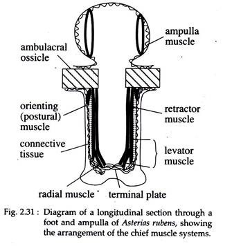 In the ampulla the muscles consist mainly of rings of smooth muscles which are set vertically and lie parallel to the long axis of the arm. Contraction of these muscles brings about protraction of the tube foot and drives the fluid out of the ampulla into the foot.