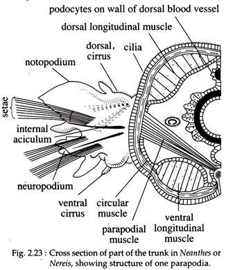 The notopodium bears a tentacle like dorsal cirrus and has two conical lobes or ligules. The neuropodium has one ventral cirrus and one ligule. Each parapodial lobe contains pocket or setal sacs from which many chitinous bristles or setae arise and project beyond the end of the parapodial lobe (Fig. 2.23).