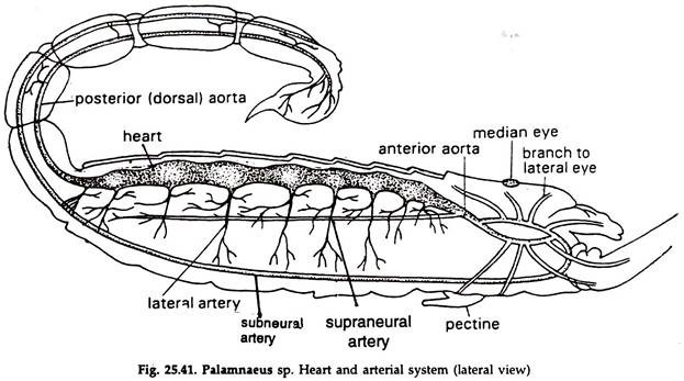Each thoracic sinus sends a small vessel to the supraneural artery and four large vessels to the appendages supplying haemolymph to the pedipalp and legs of the side. The heart continues posteriorly as posterior aorta. It runs straight backward up to the posterior tip and supplies to the intestine as well as various organs by a number Of delicate branches.