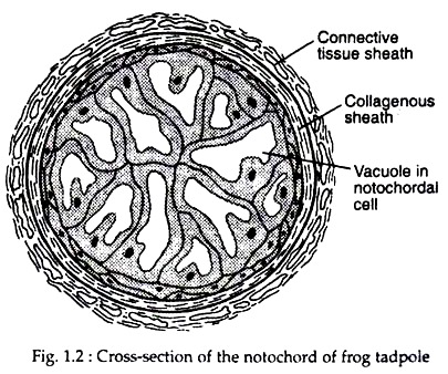 1. Notochord is present in any stage of the life-history. It is a slender rod that arises out of the dorsal wall of the embryonic gut in primitive chordates. Notochord lies dorsal to the coelom and parallel beneath the central nervous system. The notochord is composed of a core of cells and fluid encased in a tough sheath of fibrous tissue (Fig. 1.2). Notochord provides mechanical support and lateral flex to the body.