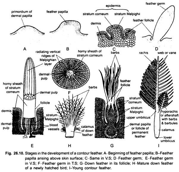 Feathers, like scales, arise in the embryo from papillae of the skin formed of dermis with an epidermal covering. The down feathers and contour feathers have different types of development, therefore, should be discussed separately as under.