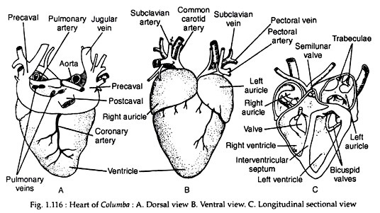 Single right aortic arch from the left ventricle conveys the oxygenated blood to the different parts of the body. The heart of pigeon is a double circuit heart and there is no chance of mixing up of oxygenated and deoxygenated blood except in the capillaries. This is a significant evolutionary advancement in birds over reptiles.