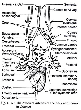 A slender syringobronchial artery — supplies oesophagus, trachea, syrinx and bronchus. Comes nervi vagi artery—gives many branches to thyroid, crop, oesophagus, skin of neck etc. The comes nervi vagi artery passes alongside the vagus nerve and opens into the external carotid very near to its origin from the internal carotid artery.