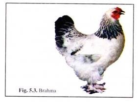 Brahma (Fig. 5.3) is an Asiatic breed of fowl, previously called Chittagongs, Gray Shanghais, and Brahma Pootras, later shortened to Brahma. It is thought to be a product of a cross of the Malay and Cochin breeds in India. Imported from Shanghai, China, in the early 1840’s, they landed in New England much later.