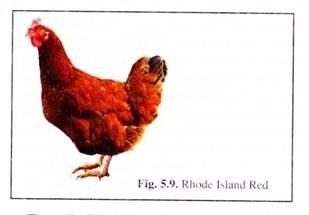 The origin of the Rhode Island Red (Fig. 5.9) dates to a fowl bred in the section of New England that is located between Narragansett Bay and Buzzard’s Bay. The name Rhode Island Red was given to the breed in honour of the state where it originated from crossing the Red Malay Game Leghorn and Asiatic native stock.