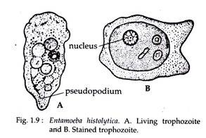 The endoplasm often contains ingested red blood corpuscles, whose number may vary from 1 to 10 and are usually smaller in size than the normal. The endoplasm may also contain occasionally leucocytes and tissue debris. Pseudopodia is either long, finger-like or short and rounded in shape (Fig. 1.9).