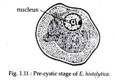When the parasite encounters shortage of food or any unsuitable environment, it assumes a colourless, round or slightly ovoid body with a blunt pseudopodia projecting from the periphery. The ectoplasm is hardly recognisable. The pre-cystic form (Fig. 1.11) is much smaller in size, measuring 10-20 µm in diameter.
