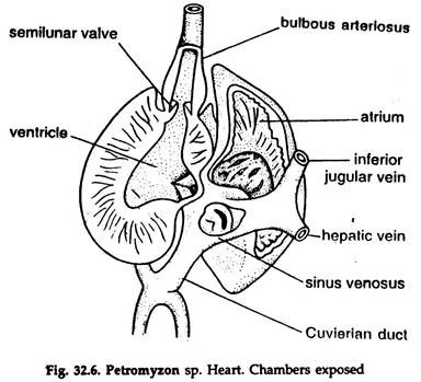 The venous system consists of true veins and network of venous sinuses. The caudal vein bringing back blood from the tail region and running anteriorly divides into two posterior cardinal veins in the posterior end of the abdominal cavity. The cardinals receive blood from myotomes, kidneys and gonads and open into the heart by a single ductus Cuvieri on the right side (Fig. 32.6). The left ductus Cuvieri is absent in adult.