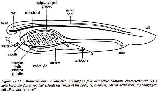 This animal exemplifies all four of the salient features of the chordates. The first is the notochord, a rod that extends the length of the body and serves as a firm but flexible axis. The notochord is a structural support. Because of it, Branchiostoma can swim with strong undulatory motions that move it through the water with a speed unattainable by the flatworms or aquatic annelids.