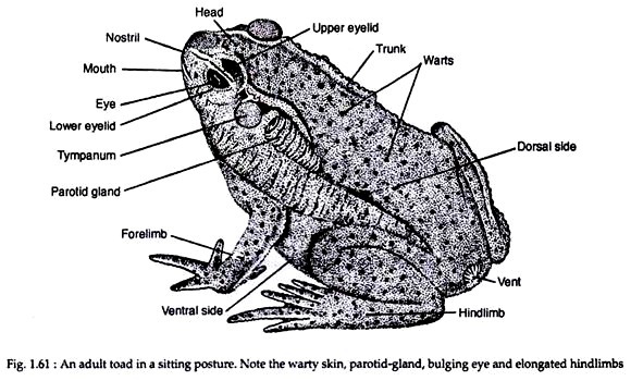 Toad has a short bilaterally symmetrical body (Fig. 1.61). There is no exoskeleton over the skin, i.e., the skin is naked skin is rough in texture. The dorsal side of the body is blackish-gray while the ventral side is yellowish grey. Toad can change the colour of the body to match with the hues of its surroundings.