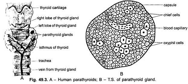 In cyclostomes, cartilaginous and bony fishes parathyroid glands have not been found as compact glands but are probably represented by diffuse cells behind the last pair of visceral clefts. In tetrapoda they form one or two pairs of compact glandular masses lying close to the thyroid glands or partially embedded in the thyroid or thymus glands. In reptiles the parathyroid glands are usually situated posterior to the thyroid gland, which is unpaired, at least in adult reptiles. In man they form four minute yellowish glands attached to the dorsal side of thyroid.