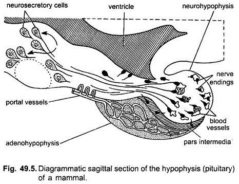 The pituitary is a compound organ. It is formed in the embryo by an ectodermal evagination of the stomodaeum, called Rathke’s pouch which finally fuses with a ventral down growth of the infundibulum to form a pituitary gland or hypophysis cerebri. Except in a few lower forms the Rathke’s pouch loses its connection with the stomodaeum. Some authorities use the term hypophysis for Rathke’s pouch, while others use it for the entire pituitary gland, here the latter nomenclature is followed.