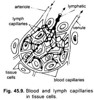 They are interwoven with but independent of blood capillaries. Lymph capillaries form an anastomosing network in all the body organs except in the nervous system. The diameter of lymph capillaries is larger and less uniform than that of blood capillaries.