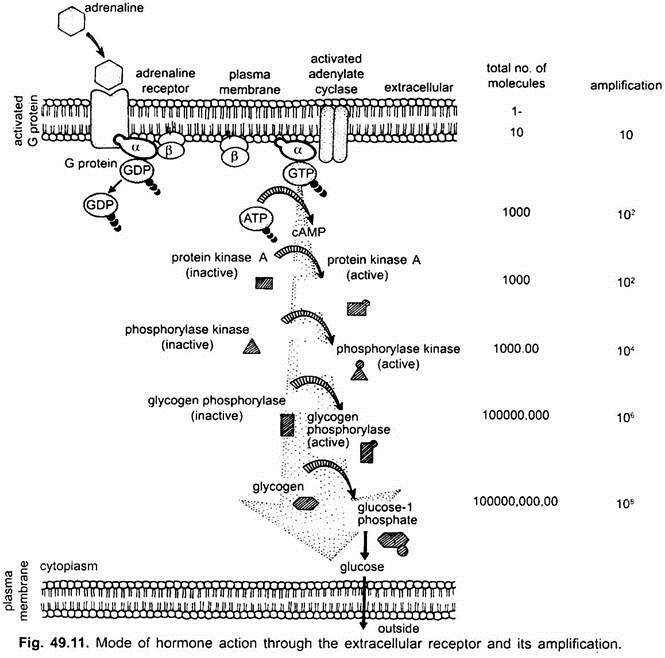 The increased level of cAMP activates the enzyme protein kinase A. Activated protein kinase A activates the enzyme phosphorylase kinase. Each molecule of protein kinase activates about 100 molecules of enzyme, phosphorylase kinase and soon. As a result, a single molecule of adrenaline releases as many as 100 million molecules of glucose within only 1 or 2 minutes. However, a very small quantity of hormone is needed.