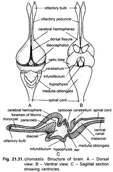 The nervous system in Uromastix is generally on the amphibian plan. Many differences in the plan of nervous system between the two groups are not apparent anatomically but reptiles, however, indicate a higher degree of nervous efficiency. One of the major differences is the absence of lateral line system in reptiles. The absence of this system has been fully compensated by improvements in the sensory organs.