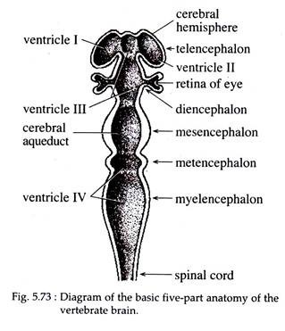 The brain as well as the spinal cord are hollow structures and this cavity is generally called the neural cavity or neurocoel (Fig. 5.73). The neurocoel are fluid-filled cavities. The cavities of the telencephalic vesicles extend into the cerebral hemispheres (cerebral lobes) and are known as the lateral ventricles or the first and second ventricles.